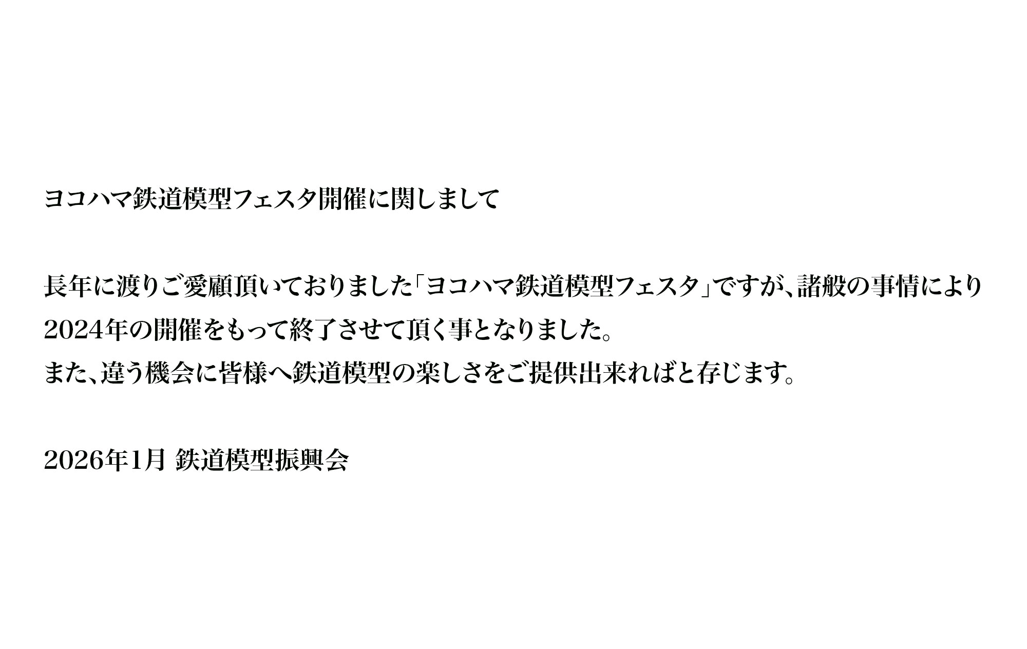 長年に渡りご愛顧頂いておりました「ヨコハマ鉄道模型フェスタ」ですが、諸般の事情により2024年の開催をもって終了させて頂く事となりました。